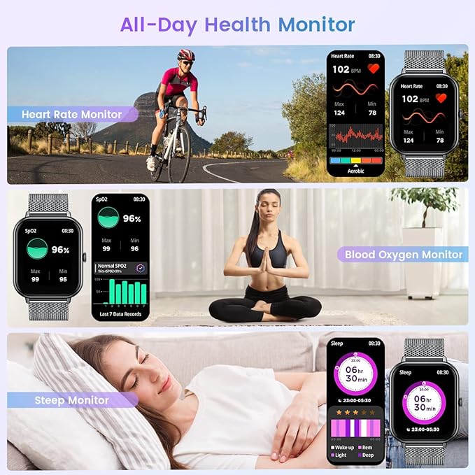 • All Day Activity & Fitness Tracker: Sports smart watch can provide 100+ exercise modes such as walking, running, mountaineering, football, yoga, hiking, cycling, etc. During your exercise, it will record your data like heart rate, steps, calories burned, distance and active hours in real time. Smartwatch use the GPS of the user's mobile phone to track their movement and distance. The fitness tracker is IP67 waterproof so you can wear it during outdoor activities, rainy day, washing hand.