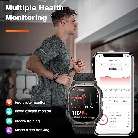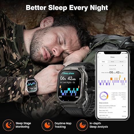 Special Feature 60 Days Long Battery Life, Military Rugged Grade Design, 50M Waterproof, Bluetooth Answer and Make Call, AI Voice Assistant, App Notifications, Health and Sport Monitor