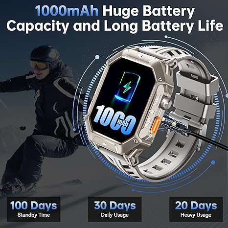• 【Up to 100 Days Battery】:This military smart watch has a powerful 1000mAh battery capacity, which provides up to 25 days of uptime, and up to 100 days of battery life when you continue to use the sports mode, health check and other functions with the power saving mode on. Without a doubt, it will be your best companion for short-distance outdoor activities and adventures.